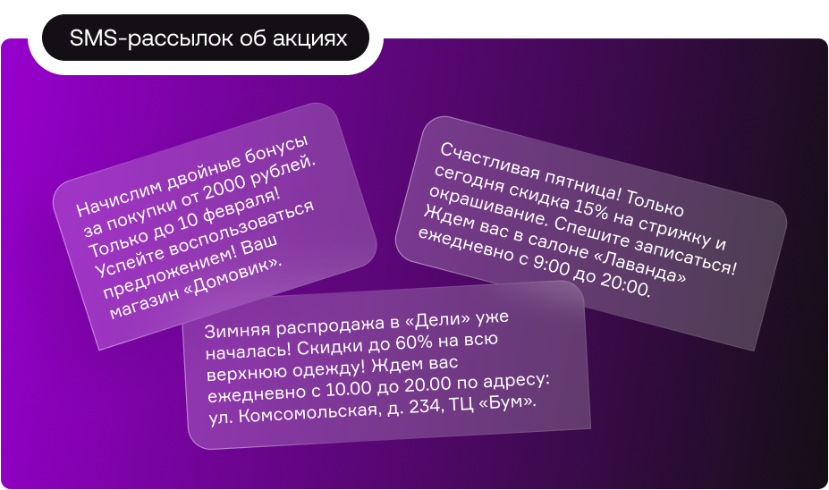 Шаблоны для рассылок похожи на конструктор. Они позволяют компаниям придерживаться корпоративного стиля в общении с потенциальными или существующими покупателями. Чаще всего текстовые заготовки используют в сфере услуг, офлайн-ритейлерами, службами доставок. Меняя данные в предложениях, можно пригласить клиентов на распродажу, подарить им промокод, напомнить о записи на прием или сообщить о поступлении посылки в постамат.